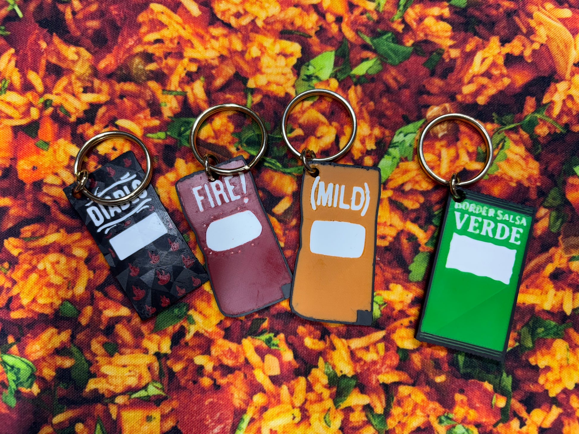 3D Printed sauce keychains. Set of 4 Add some flavor to your daily routine with these 4 sauce keychains. The perfect blend of burrito and hot sauce, they're sure to spice up your keys and your life. (But don't actually try to eat them!)